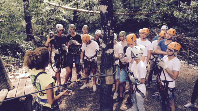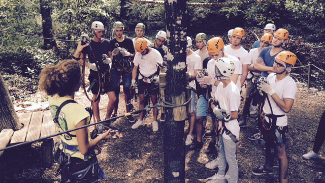 Le BTS M.U.C de Stanislas au départ de pistes d'accro-branche : équipements, consignes de sécurité, conseils sont donnés aux étudiants avant qu'ils s'élancent sur les différents circuits en fonction des niveaux de chacun. Un excellent moment d'intégration en perspective, permettant les liens et la cohésion entre étudiants de première année et deuxième année.