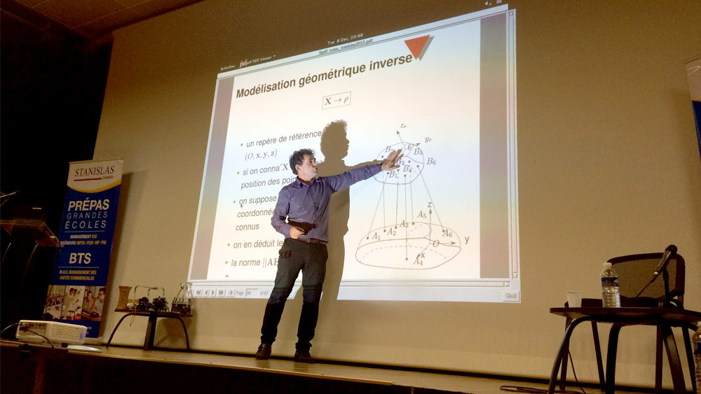 Dans le cadre des Conférences OPEN de l’Enseignement Supérieur de Stanislas Cannes, pilotées et organisées par Mme Dominique Mahé, Enseignante-Documentaliste à Stanislas, les étudiants de Classes Préparatoires Scientifiques ont eu le privilège d’écouter M. Jean-Pierre MERLET, Directeur de recherche à l’INRIA. La conférence portait sur le thème suivant : « Un exemple de vrai robotique : le transfert de personne fragile ».