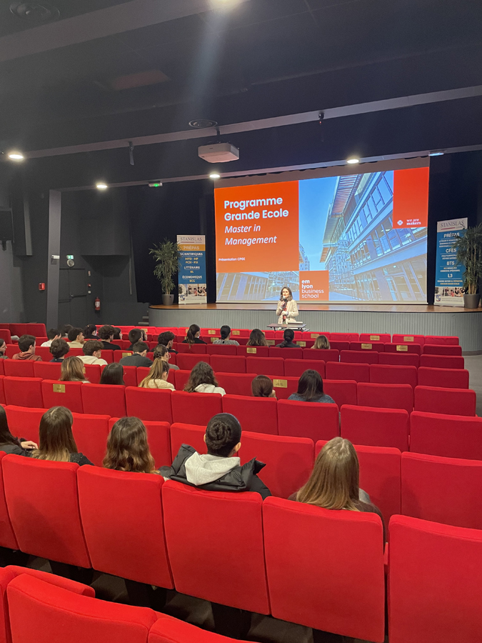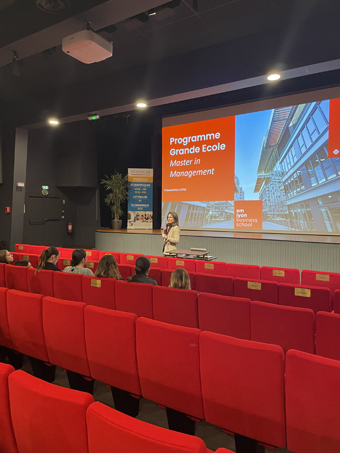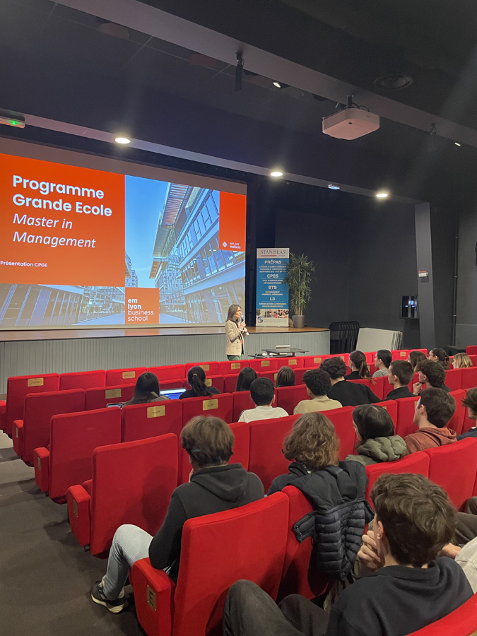L'EM Lyon, en la personne de Mme Tardy, Responsable des admissions et du rayonnement du PGE, est intervenu devant les étudiants/tes de classe préparatoire de Stan. L'occasion de présenter le Programme Grande Ecole, ses parcours, ses spécialités, sa dimension internationale et de mieux informer les étudiants sur les spécificités de l'Ecole.