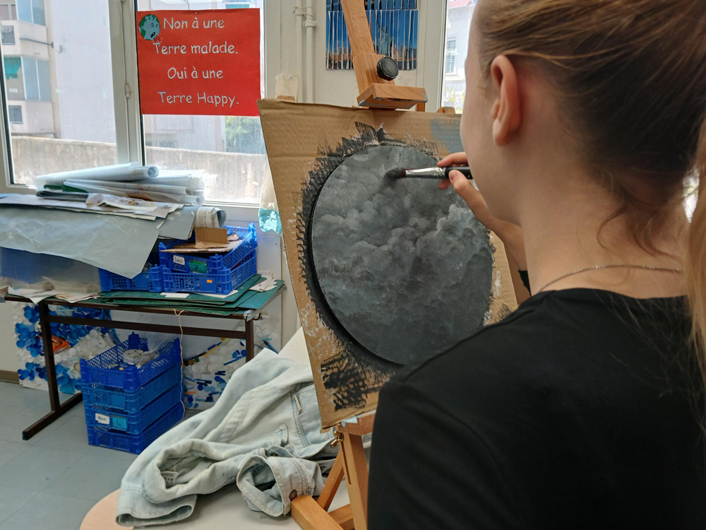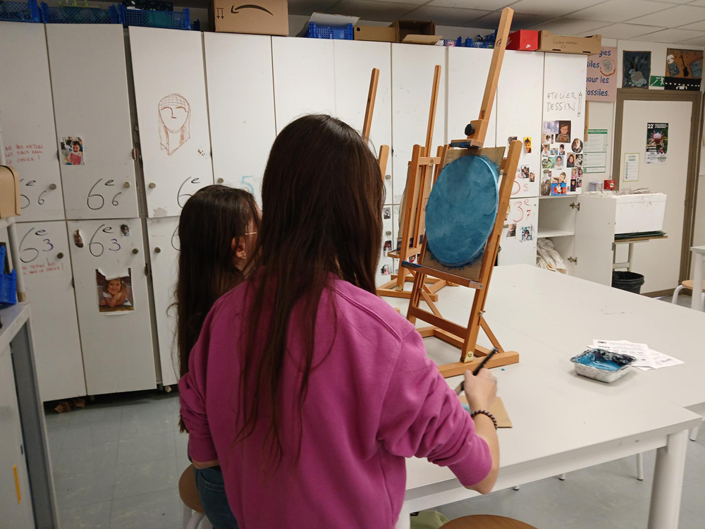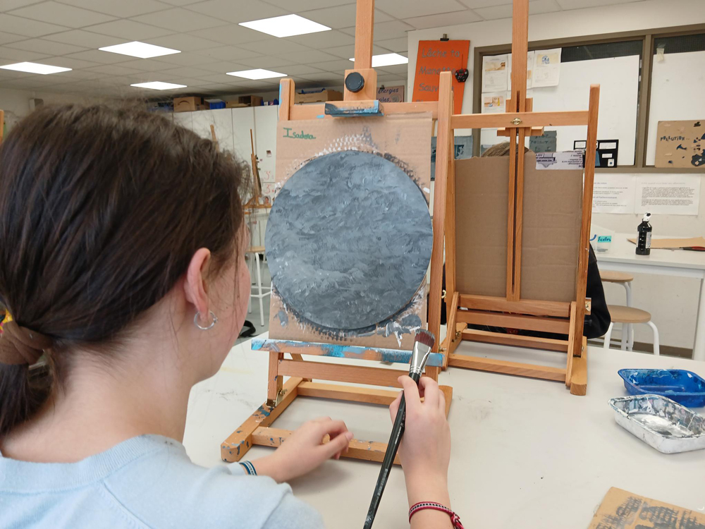 Dans le cadre de l'atelier de peinture, animé par M. Cuttaïa, les élèves développent leur sensibilité artistique. La thématique de l’année est "le ciel sur tondo de bois" peinture acrylique.