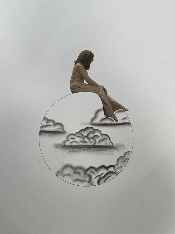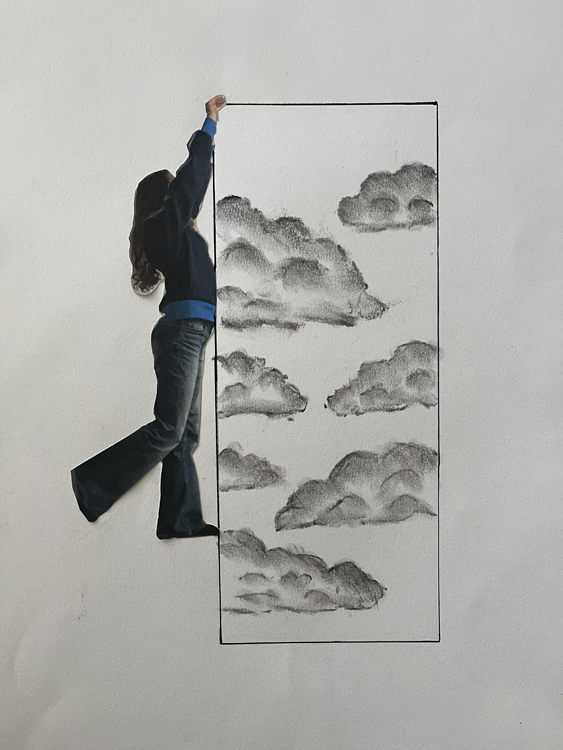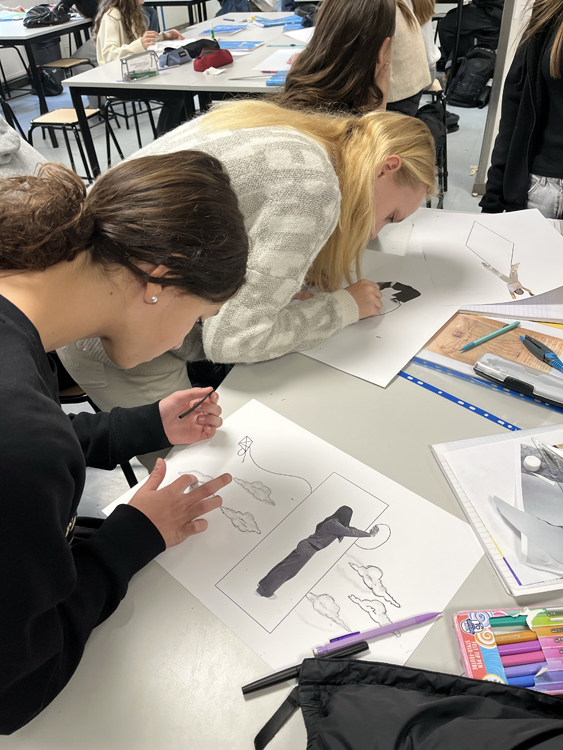 Les élèves de 3ème ont travaillé sur la mise en scène entre Corps et espace : Travail de Photographies de postures puis de rapport d’échelle et enfin d’utilisation de la technique du Fusain pour les nuages.