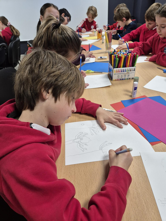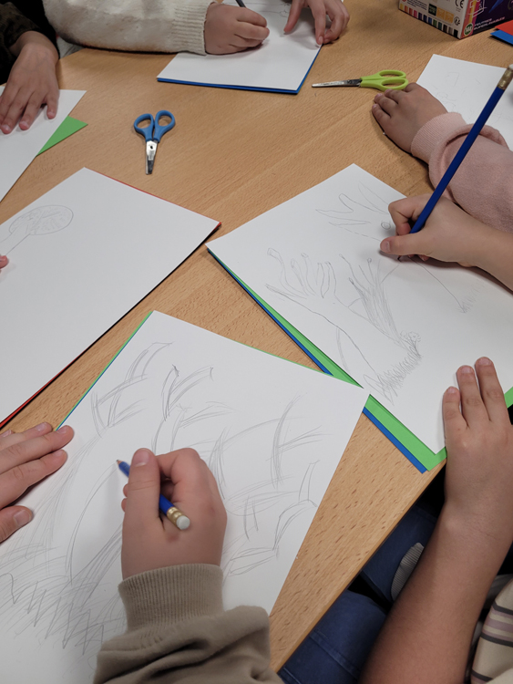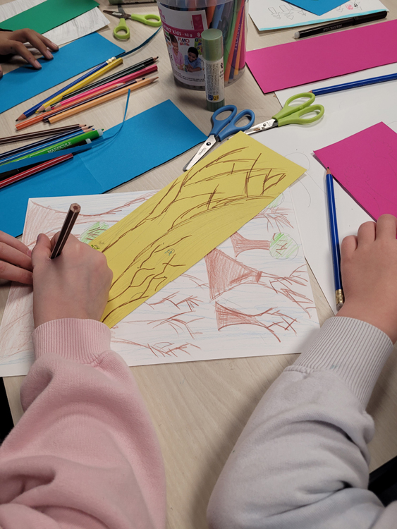 Lors de l’atelier, les élèves ont à leur tour expérimenté la création artistique en réalisant une œuvre figurative évoquant une forêt. Par superposition de feuilles colorées et découpées, ils ont exploré les couleurs et les mouvements, pour se rapprocher du sensible et de l’émotion.