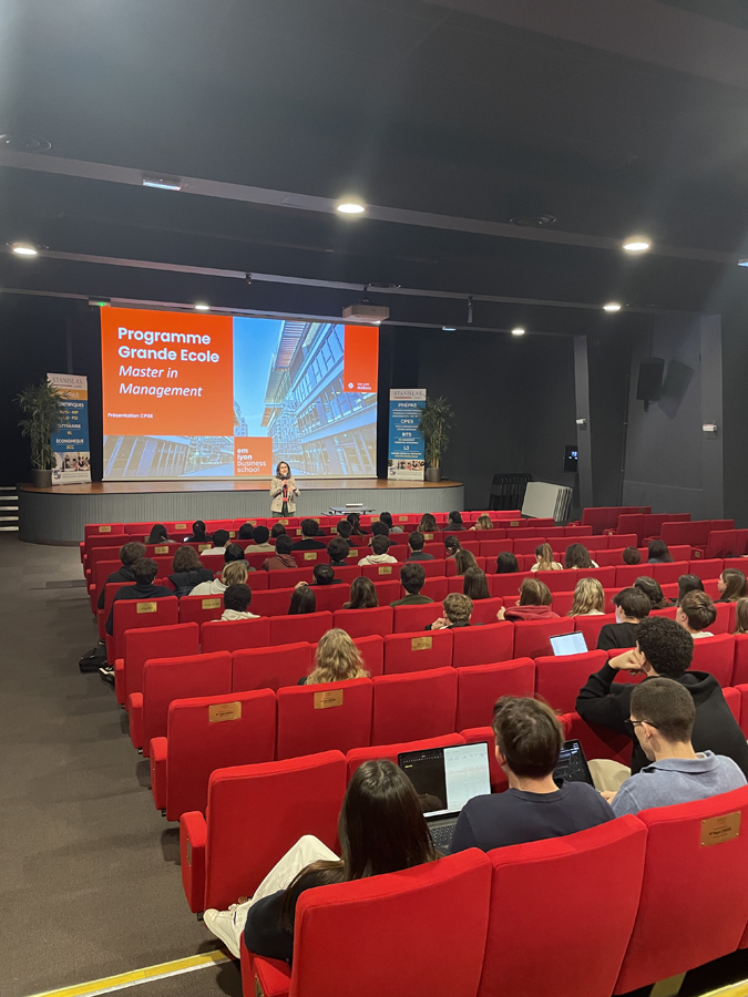 L'EM Lyon, en la personne de Mme Tardy, Responsable des admissions et du rayonnement du PGE, est intervenu devant les étudiants/tes de classe préparatoire de Stan. L'occasion de présenter le Programme Grande Ecole, ses parcours, ses spécialités, sa dimension internationale et de mieux informer les étudiants sur les spécificités de l'Ecole.