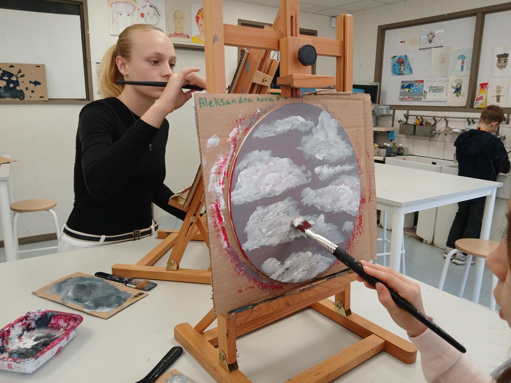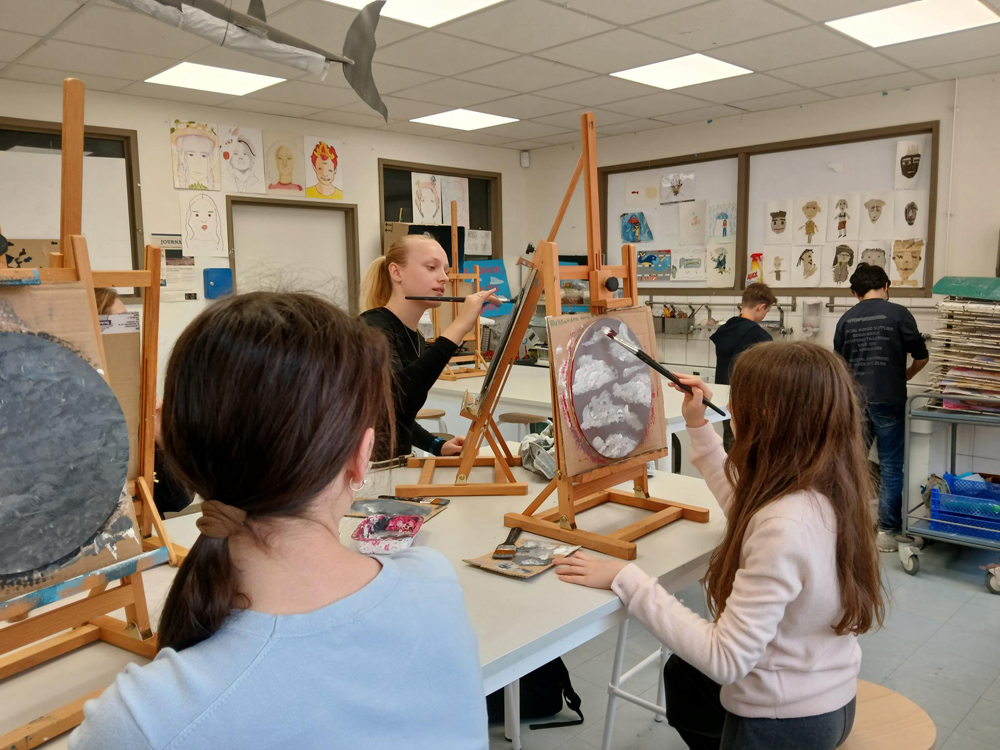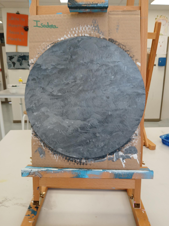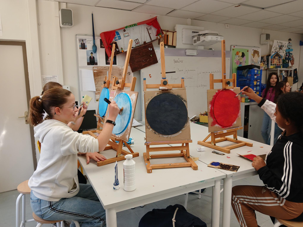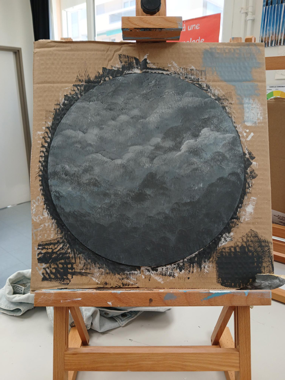 Dans le cadre de l'atelier de peinture, animé par M. Cuttaïa, les élèves développent leur sensibilité artistique. La thématique de l’année est "le ciel sur tondo de bois" peinture acrylique.